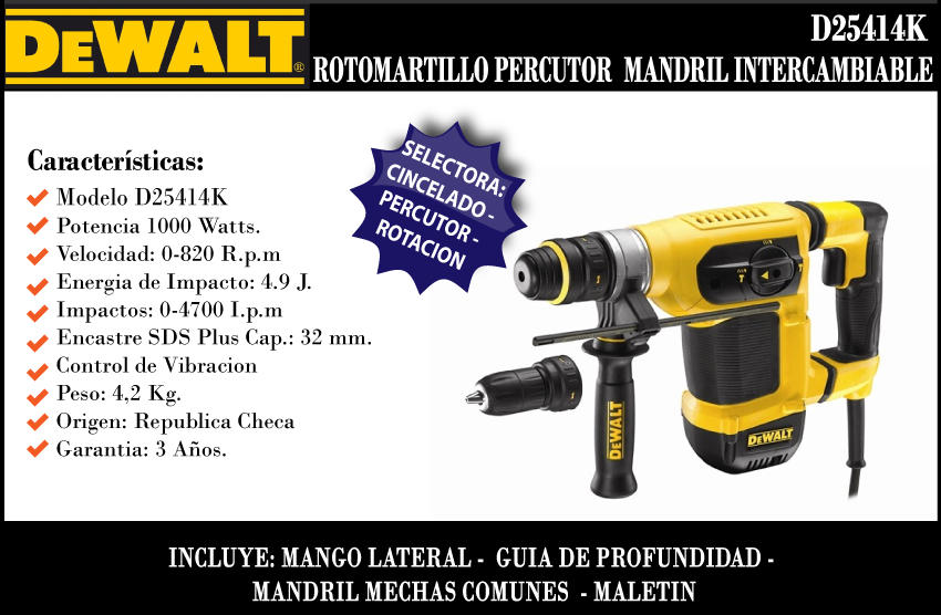 Dewalt Martillo Rotativo Plus D25414k 1000w 4,2j 32mm 820rpm