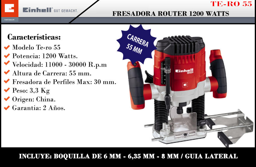 Einhell Fresadora Router 1200 W Boquilla 6 - 8 Y 1/4 Te-ro55