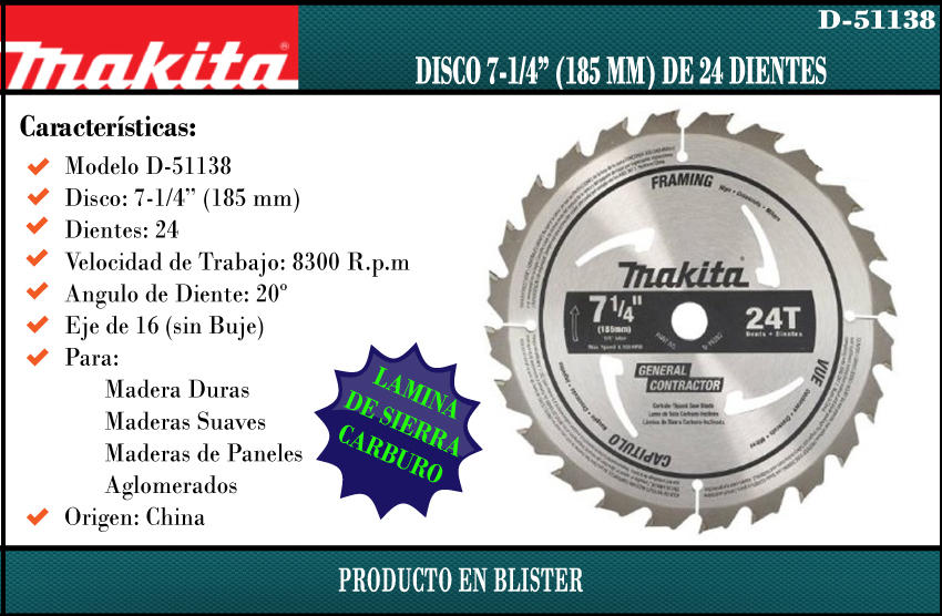 Makita Disco Sierra Circular 71/4" 185mm 24 Dientes