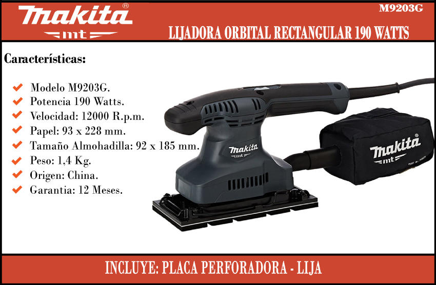Makita Lijadora Orbital Mt 190w 1/3" Lija Base Rectangular (ex Mbo372)