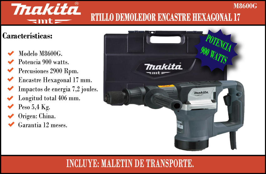 Makita Martillo Demoledor Mt Hex 17 M8600g 900w 7,2j