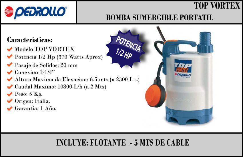 Pedrollo Bomba Sumergible Portatil Top Vortex 220v 0.5hp Impulsor Vortex