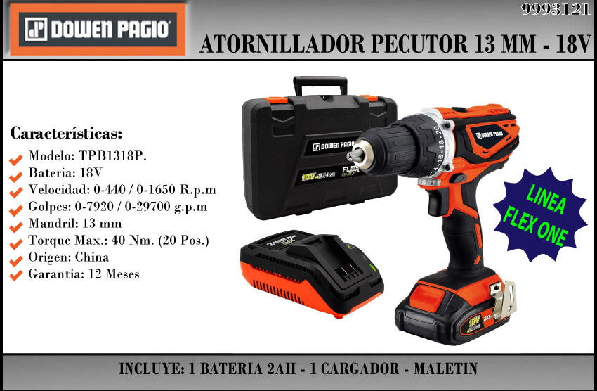 Dowen Pagio Atornillador Taladro C/perc 13mm 18v Litio 1 Bateria + 1 Cargador