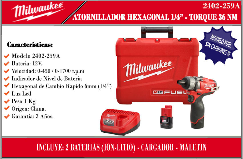 Milwaukee Atornillador 1/4 Hex. 36 Nm 12 V Li 2 Amp Sin Carbones Fuel