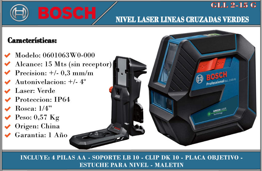 Bosch Nivel Laser De Linea Verde Gll2-15 G 15 Mts Lineas C/ Sopte Lb 10 Reflector