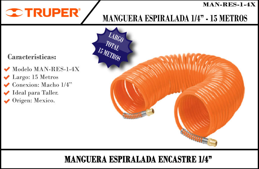 Truper Manguera Espiralada 1/4" X 15 Mts