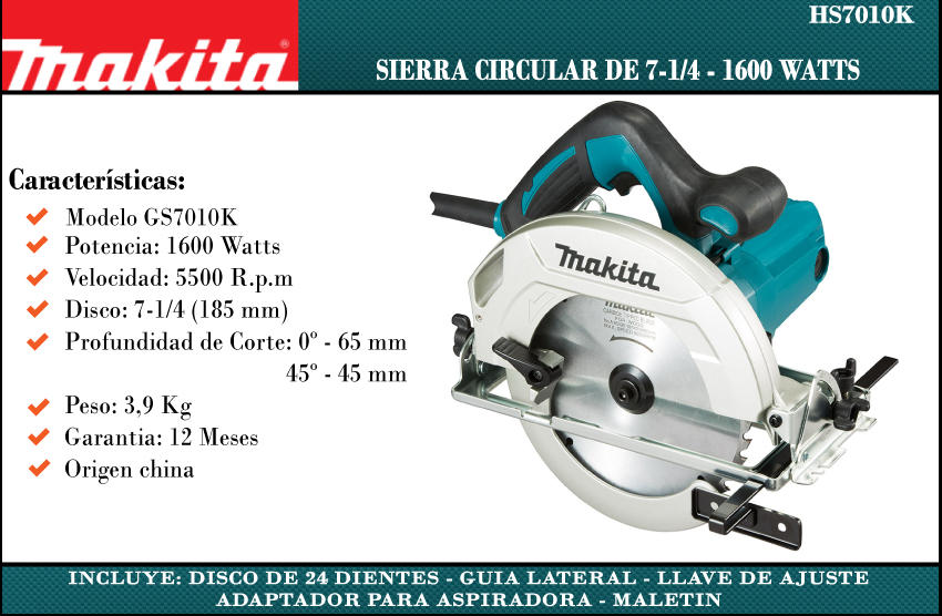 Makita Sierra Circular 7-1/4 1600w 185mm Mod Hs7010k