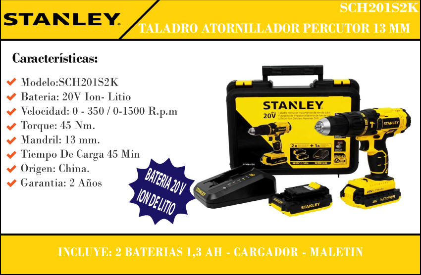 Stanley - Atornillador Taladro 13mm Percutor 20v 2vel. Mec. Rev. Led 2bat 1,3a Carg. Maletin Sch201c2k