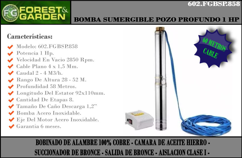 Forest Garden Bomba Sumergible Pozo Prof.1 Hp Ac.inox 8 Etap. 58 Mts.