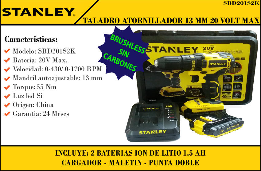 Stanley - Atornillador Taladro 13mm Percutor 20v 2vel. Sin Carbones Brushless