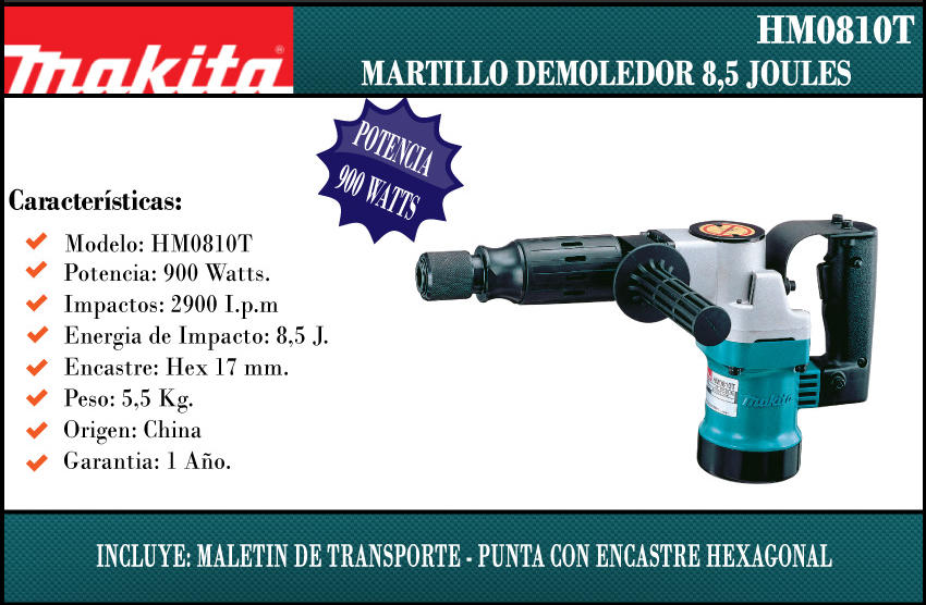 Makita Martillo Demoledor Hex 17 Hm0810t 900w 8,5j