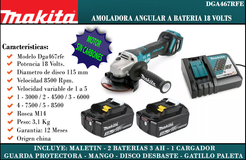 Makita Amoladora 115mm 18v Sin Carbones 2 Bat 3ah Y Cargador