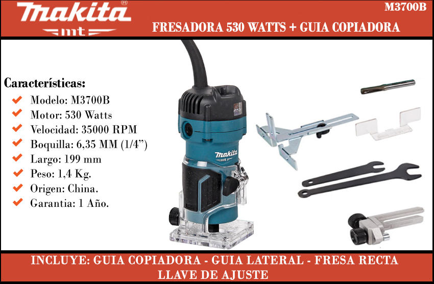 Makita Fresadora Mt 530 Watts Boquilla 1/4" + Guia Copiadora