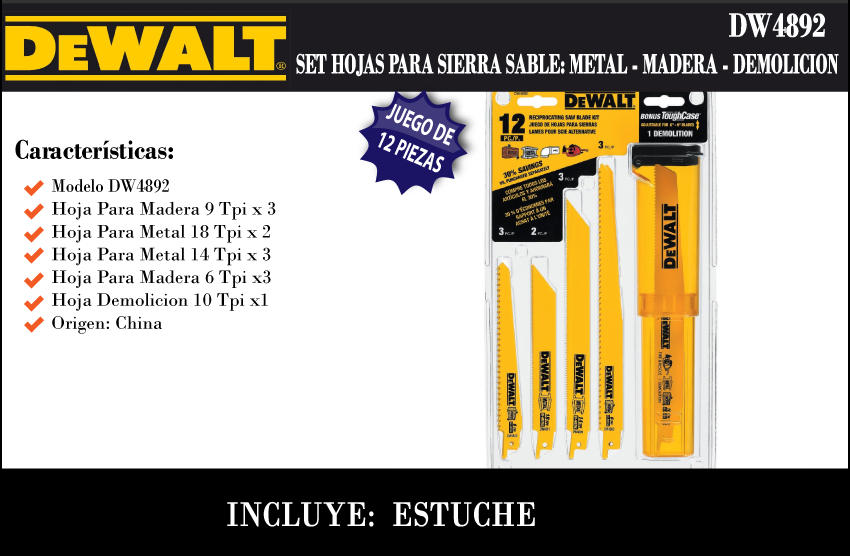 Dewalt Set Hojas Sierra Sable Surtidas 12 Pzas