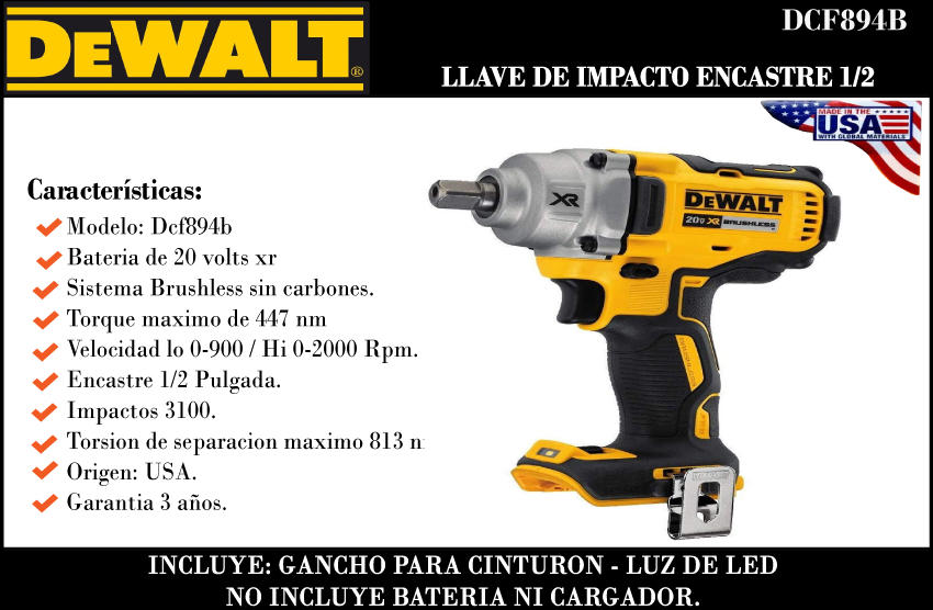 Dewalt Llave De Impacto 1/2" 20v Torque 447 Nm Brushless ( No Incluye Bateria Ni Cargador)