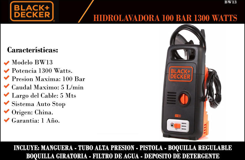 Black & Decker Hidrolavadora 100 Bar 1450 Psi 1300w Ruedas (bw13)