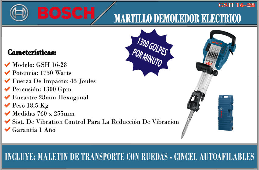 Bosch Martillo Demoledor 1750w Hexagonal 28.6 Gsh16-28 45j Aleman