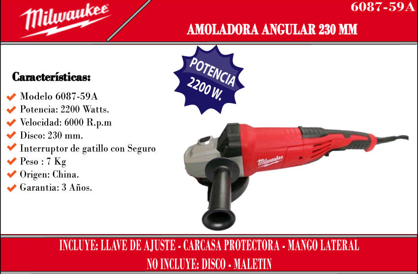 Milwaukee Amoladora 230mm 9" 2200 W Rpm6600 6087-59a