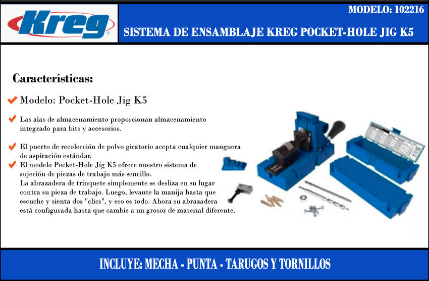 Kreg Pocket Hole Jig K5 Sistema Ensamble + Mecha + Punta Cuadrada 152mm + Estuche