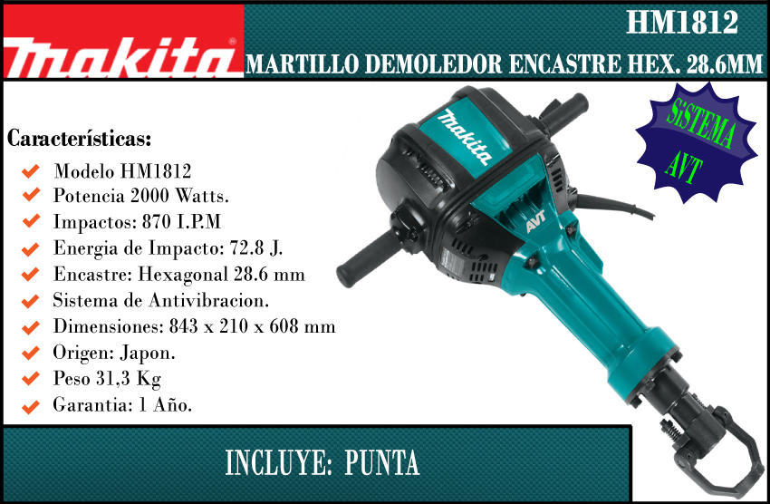 Makita Martillo Demoledor Hex 28.6 Hm1812 2000w 72.8j Anti-vibr