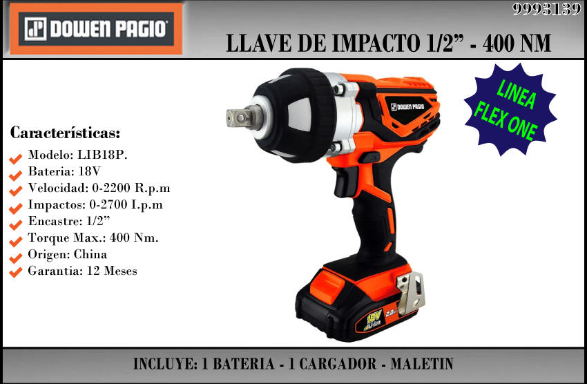 Dowen Pagio Llave De Impacto 1/2 18v 1 Bat. Litio + 1 Cargador - Flex One