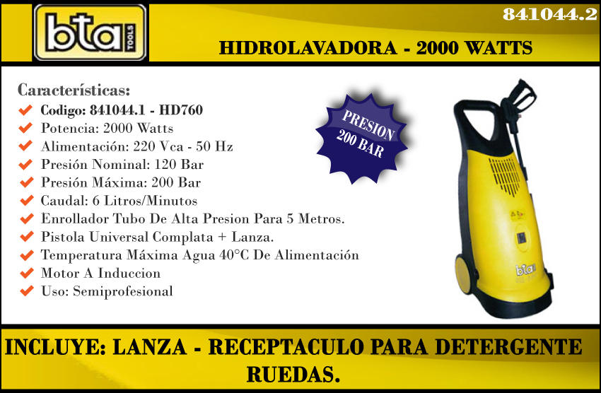 Bta Hidrolavadora Presion-200 Bar 2000 W (hd760)