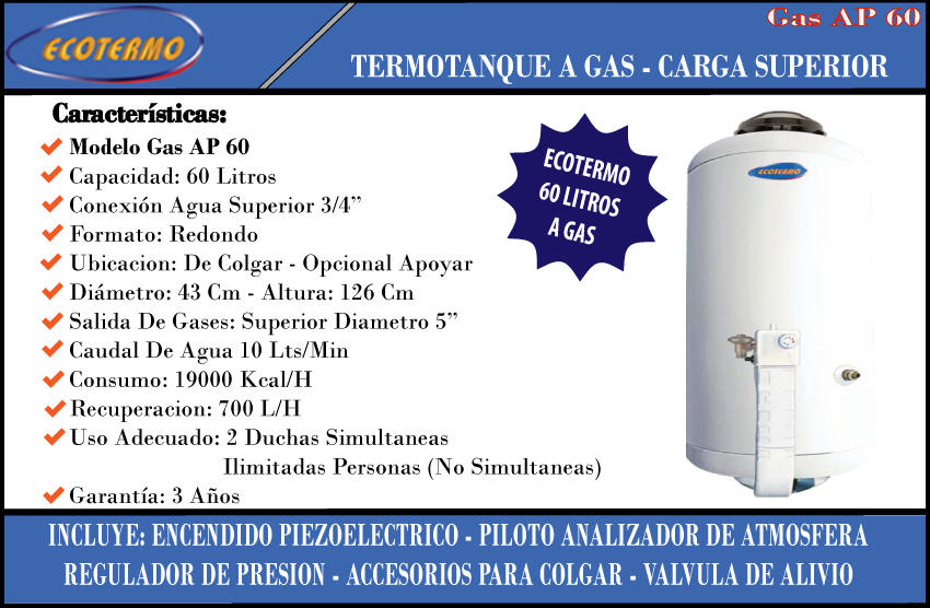 Termotanque Ecotermo 60 Lt Alta Potencia Gas Natural Encendido Piezo Electrico