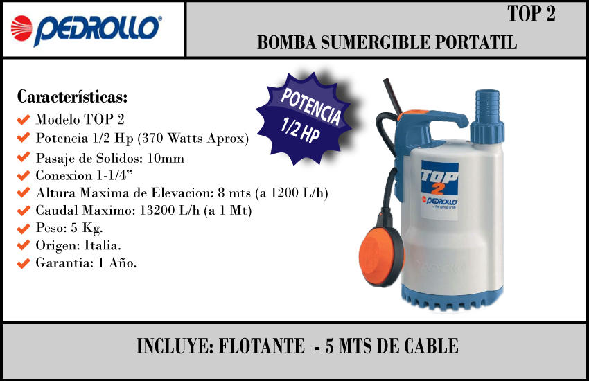 Pedrollo Bomba Sumergible Portatil Top2 220v 0.5hp Impulsor Abierto