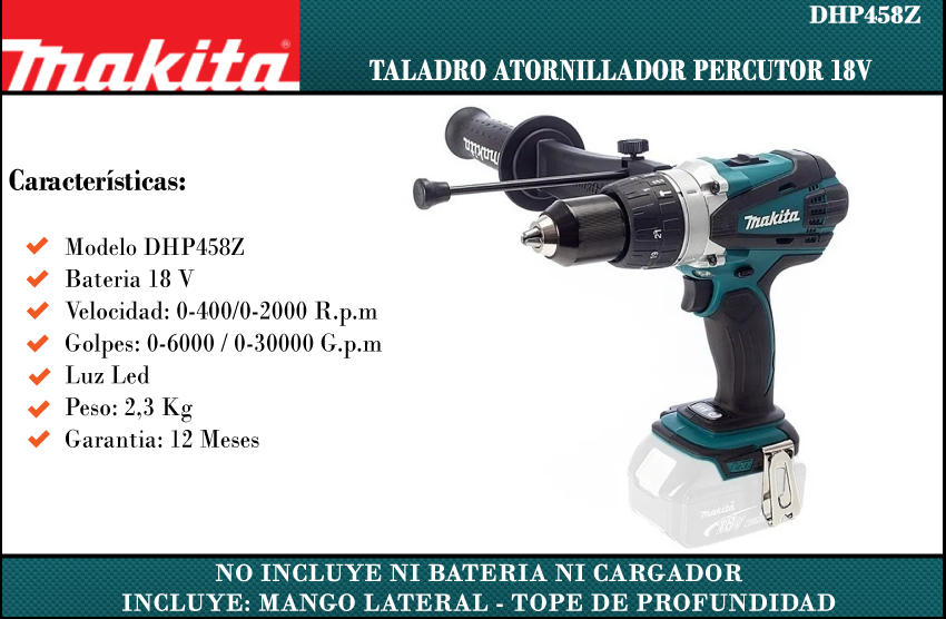 Makita Atornillador Taladro Perc 13mm 2vel. 18v S/bat S/ Carga