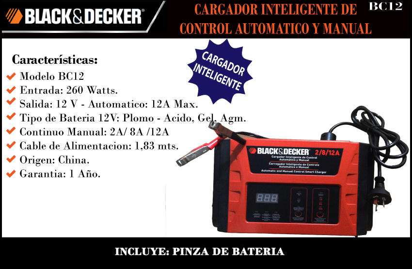 Black & Decker Cargador Automatico Bateria 12v 2 Amp Visor Led