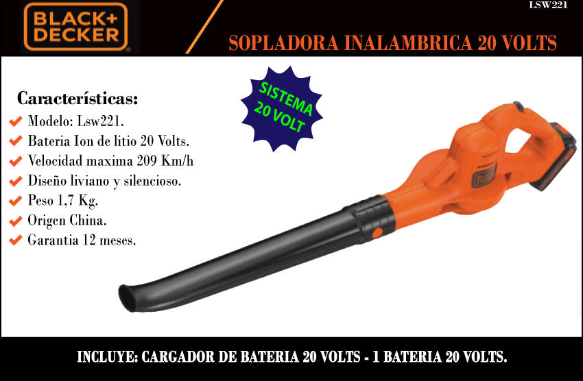 Black & Decker Soplador 20v Inalambrico 1 Bateria + 1 Cargador