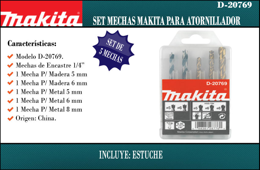 Makita Set 5 Mechas Hex X 1/4 Met 5,6,8 Mad 5,6mm