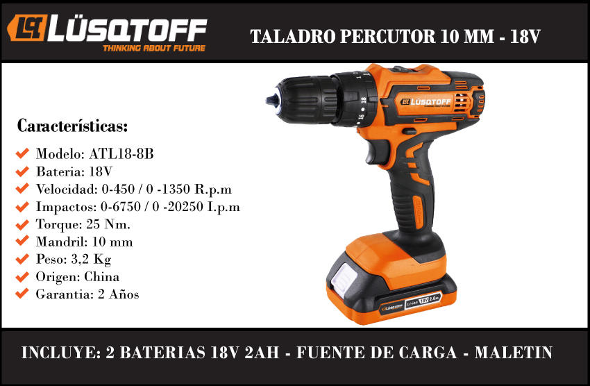 Lusqtoff Atornillador Taladro Percutor 10 Mm 18v (2 Baterias - Cargador - Maletin)