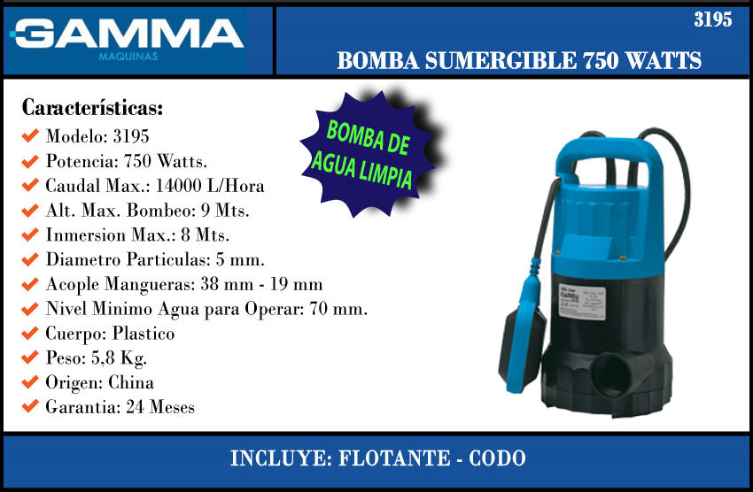 Gamma Bomba Sumergible 1 Hp 750w Plastica Agua Limpia