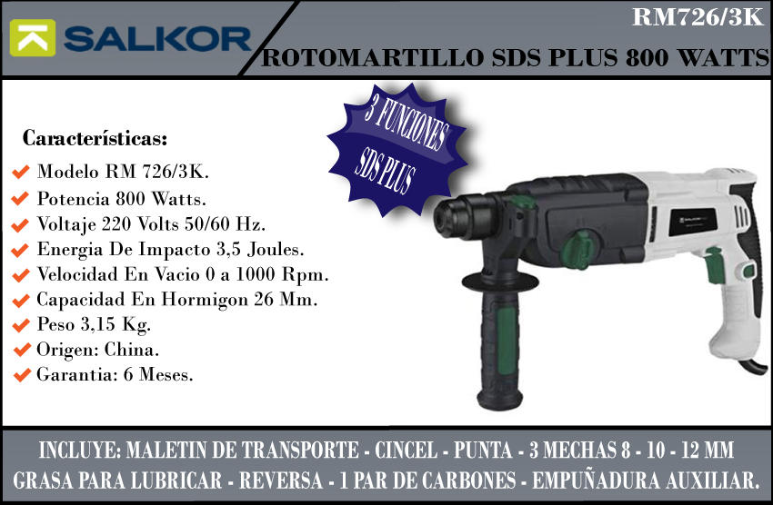 Salkor Martillo Rotativo Plus Rm726 800w 3.5j + Accesorios Y Maletin