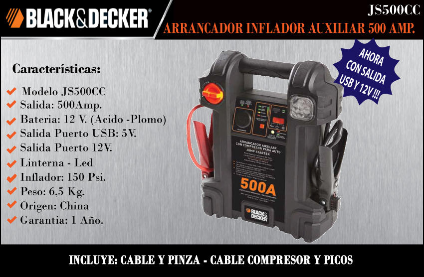 Black + Decker Arrancador 500 Amp + Compresor Puerto Usb, Luz Led, Salida 12v