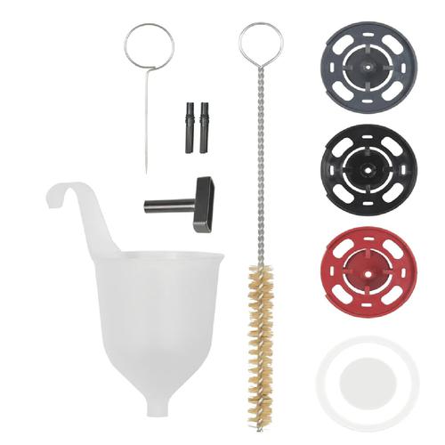 • Incluye: 3 Boquillas De Ø2.0 - Ø2.5 - Ø3.0 Mm - 1 Embudo Dosificador - 1 Cepillo Cilíndrico - 1 Punzón Para Desobstrucción - 1 Llave Tipo T - 2 Válvulas Plásticas - 1 Anillo Sellador
