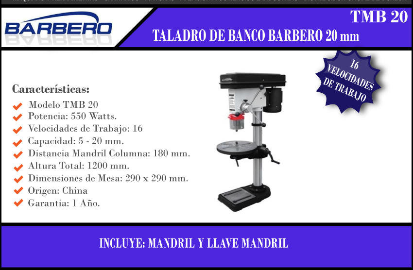 Barbero Taladro De Banco 20 Mm 550w Profesional 220v