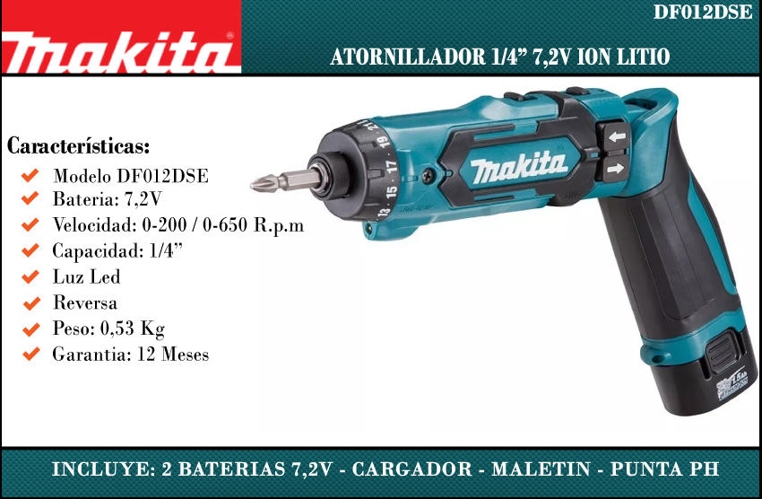 Makita Taladro Atornillador 7,2 V 650 Rpm + 2 Bat + Cargador + Maletin