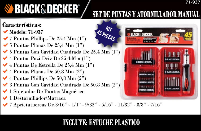 Black & Decker Set 45 Piezas Atornillador Puntas Tubos