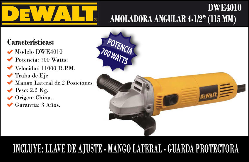 Dewalt Amoladora 115mm 750 W 11000 Rpm Dwe4010-ar