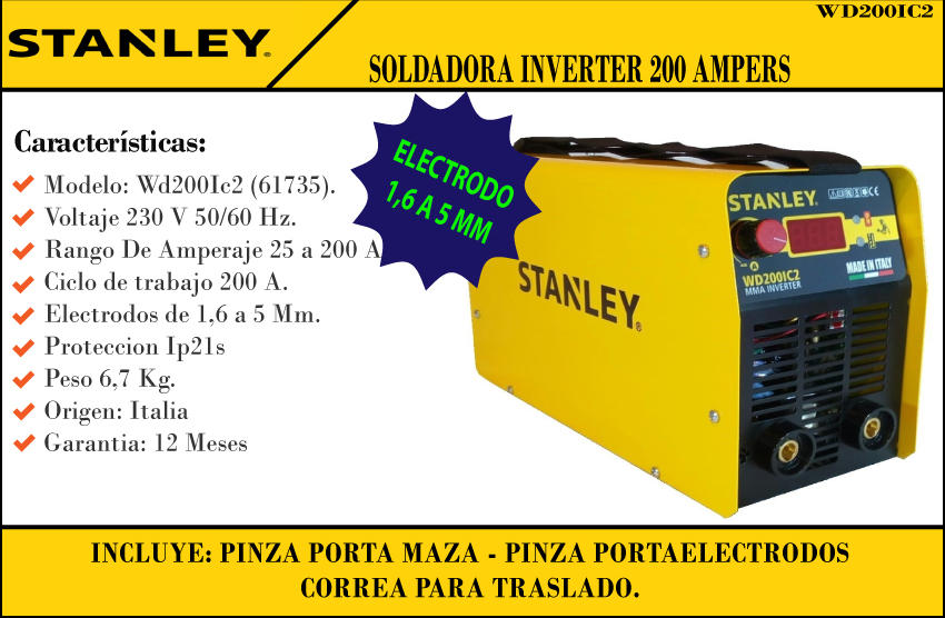 Stanley - Soldadora Inverter 200 Amp Elec. 1,6 A 5 Mm 7000 W Y Celulosico (ex Star7000)