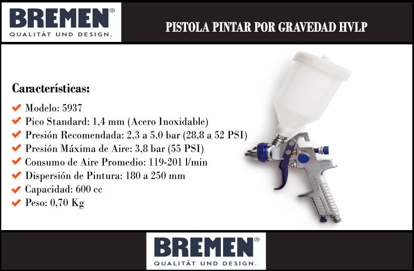 Bremen Pistola Para Pintar P/gravedad 600 Cc Hvlp