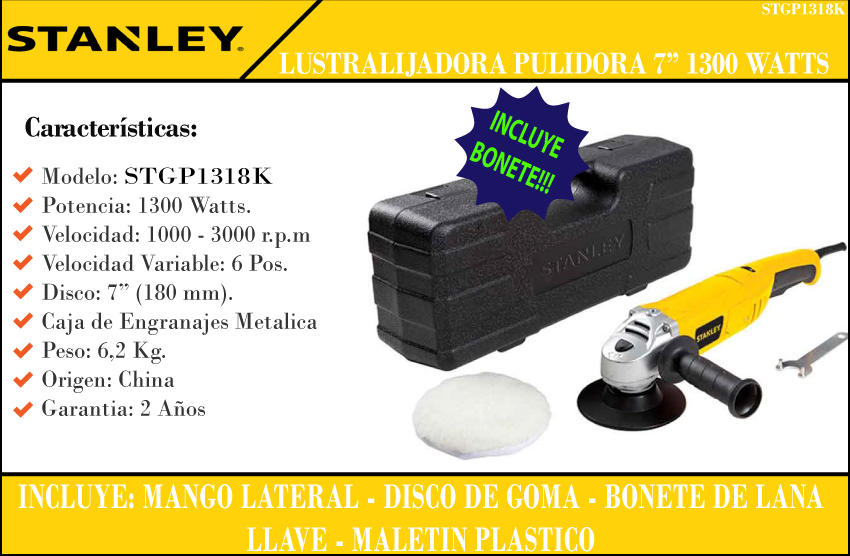 Stanley - Lustralijadora 7" 1300 W -3000rpm Maletin Stgp1318k