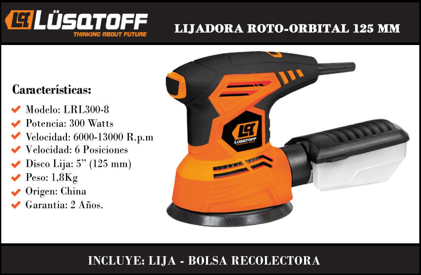 Lusqtoff Lijadora Roto-orbital 300w Lija 5" Velocidad Variable
