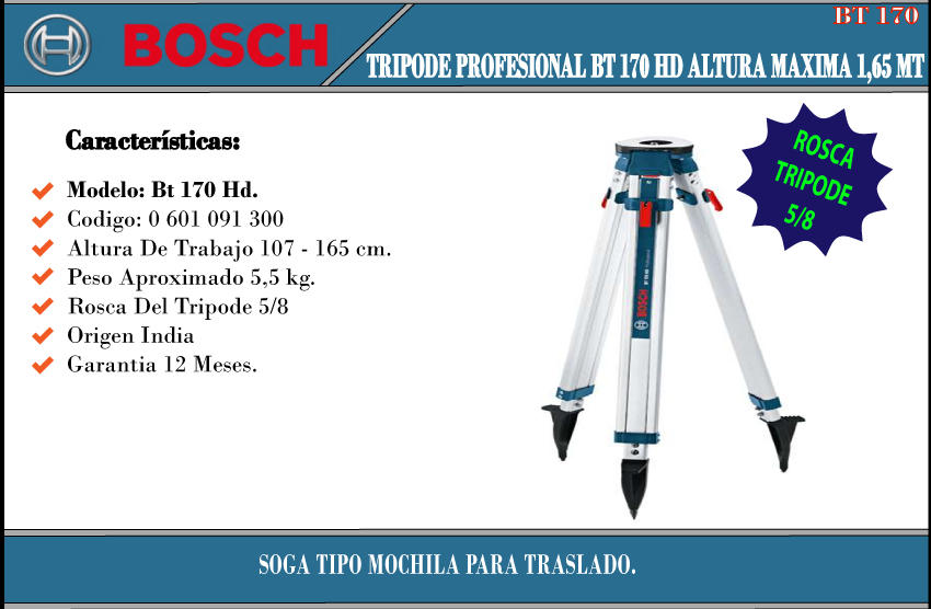 Bosch Tripode Bt 170 Hd Enc. 5/8 Altur 107 A 165 Cm