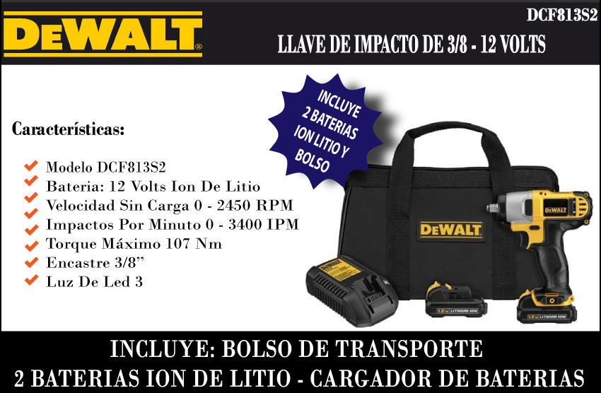 Dewalt Llave Impacto 3/8'' 2bat12v Ion-lit Luz Led(dcf813s2)