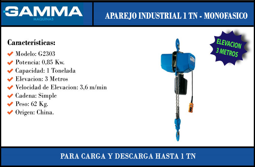 Gamma Aparejo Industrial 1 Tn. 220v Elev.3mts.