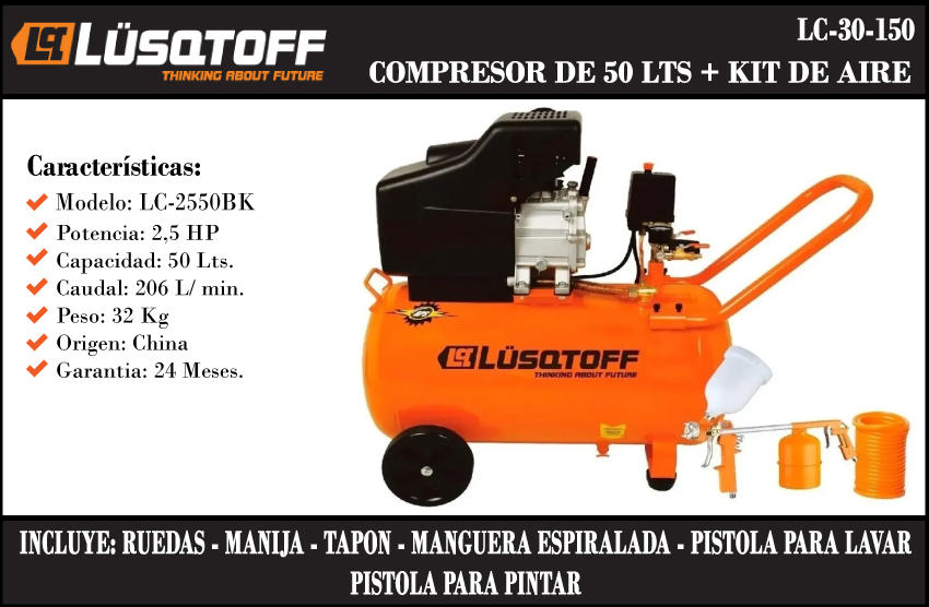 Lusqtoff Compresor 50 Lt 2.5 Hp + Kit De Aire 3 Piezas