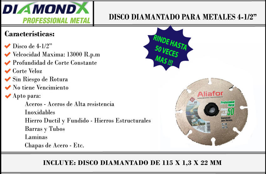 Aliafor Disco Diamantado 115 Mm 4-1/2" Para Metales